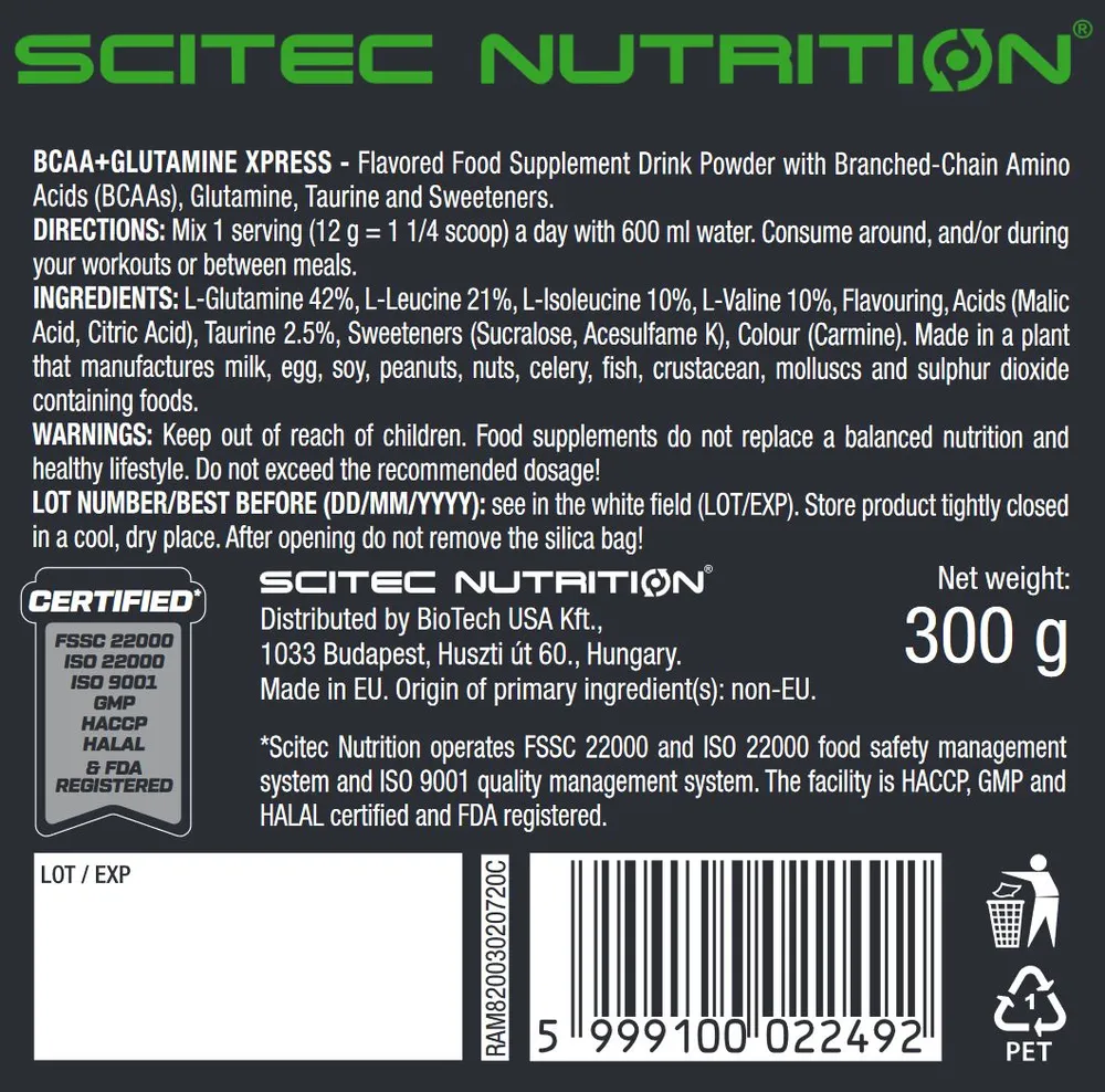 Описание Аминокислоты Scitec Nutrition BCAA+Glutamine Xpress 300 г